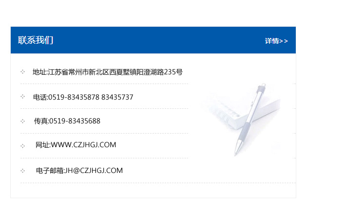 地址:常州市新北區友邦商務大廈1幢16、17層  電話:0519-85101652  傳真:0519-85112595  郵編:213022  網址:www_cz-jiayue_cn.jxkonor.com  郵箱:xiajifengaa@163.com
